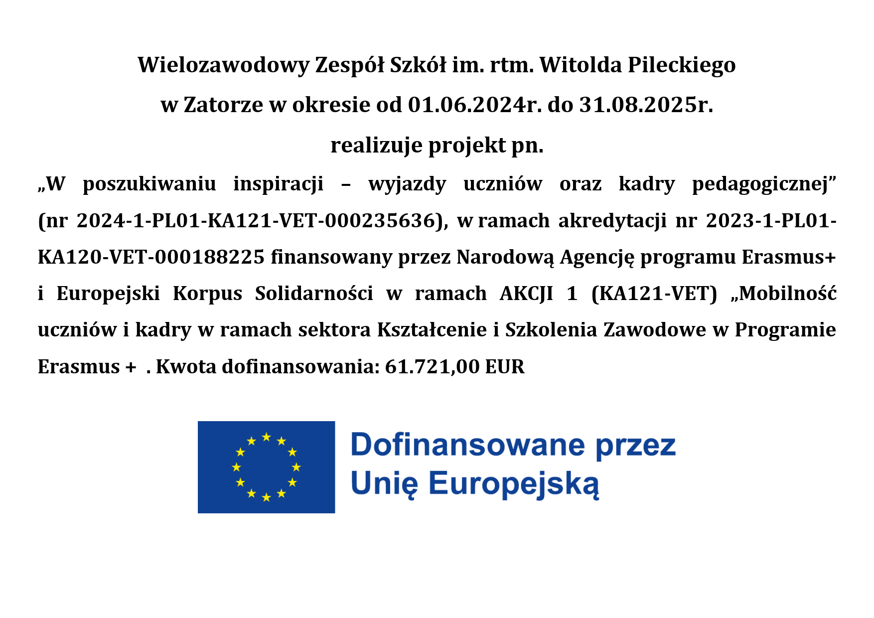 Projekt pn. „W poszukiwaniu inspiracji – wyjazdy uczniów oraz kadry pedagogicznej” nr 2024-1-PL01-KA121-VET-000235636 realizowany jest w okresie 01.06.2024 – 31.08.2025r. w ramach Akredytacji nr 2023-1-PL01-KA120-VET-000188225, dofinansowany przez Unię Europejską, na podstawie umowy 2024-1-PL01-KA121-VET-000235636 zawartej pomiędzy Wielozawodowym Zespołem Szkół im. rtm. Witolda Pileckiego w Zatorze/ Gminą Zator a Fundacją Rozwoju Systemu Edukacji - Narodową Agencją Programu Erasmus+ i Europejskiego Korpusu Solidarności.