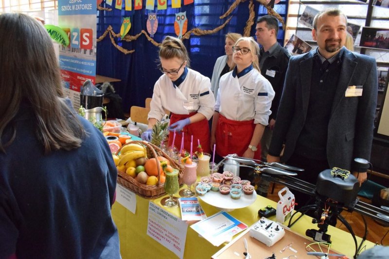 We środę (21.03.2018r.) nasza szkoła zaprezentowała się na prestiżowych Targach Edukacyjnych w Brzeźnicy pośród 19 innych placówek. Stawili się przedstawiciele niemalże wszystkich zawodów pokazując co WZS ma do zaoferowania. Od momentu wkroczenia gimnazjalistów na salę nasze stoisko było oblegane non stop. Nie ma się co dziwić, gastronomia przygotowywała na bieżąco kolorowe koktajle ze świeżo wyciskanych owoców i warzyw. Z drinkiem w ręku można było zasiąść pod palmami w asyście naszych turystów. A może pamiątkowa fotka do tego? Proszę bardzo! Można było odlecieć... nawet dronem! Jak to mawiał filmowy klasyk: "wszystkiego było w opór" ;)