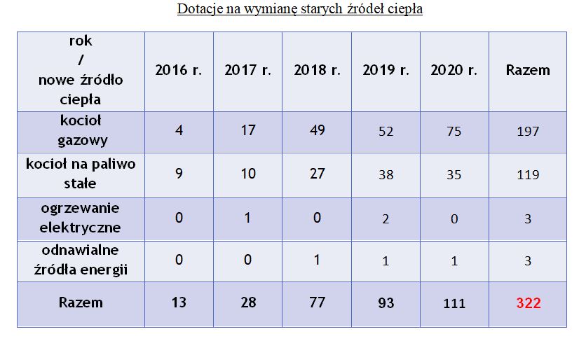 Gmina Zator w latach 2016 do 2020 udzieliła dotacji do 322 inwestycji polegających na modernizacji przestarzałego systemu ogrzewania. W samym 2020 roku mieszkańcy uzyskali wsparcie dla 111 wymian starych kotłów / pieców. Dotacje te dotyczyły montażu 75 kotłów gazowych, 35 kotłów na paliwo stałe spełniających normy tzw. ekoprojektu oraz 1 pompy ciepła.