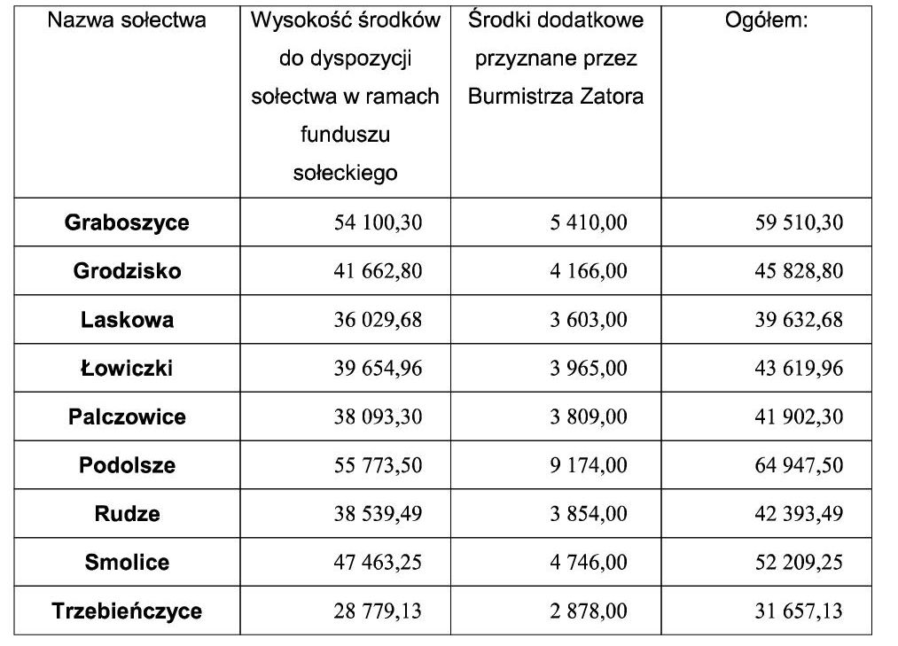 Wysokość funduszu sołeckiego wraz z środkami dodatkowymi przyznanymi sołectwom przez Burmistrza Zatora w budżecie Gminy Zator na rok 2022 dla poszczególnych sołectw wynosi: