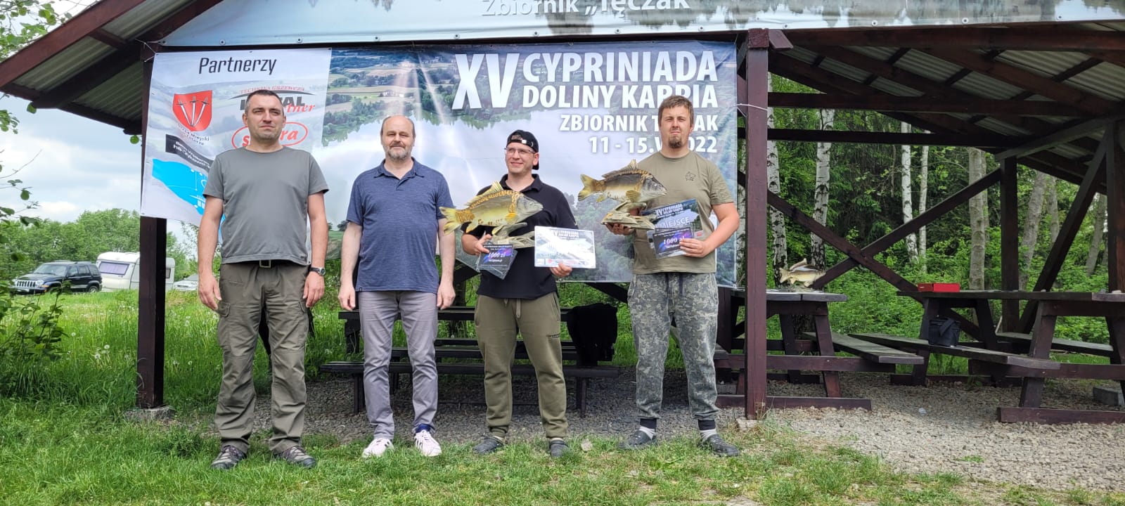 W dniach od 11 do 15 maja na zbiorniku Tęczak należącym do Zatorskiego Towarzystwa Wędkarskiego odbyła się XV Cypriniada Doliny Karpia. W zmaganiach uczestniczyło 18 dwuosobowych drużyn. Zawodnicy zjechali się na miejsce zbiórki w środę 11 maja o godz. 9:00. Po zgłoszeniu się do biura zawodów startujący otrzymali pakiety startowe oraz miał miejsce poczęstunek przepyszną grochówką przygotowaną przez naszego szefa kuchni kolegę Pawła Janasa. Nadmienić tutaj należy, że poza obiadami, które były dostarczane zawodnikom każdego dnia rywalizacji na stanowisku nr. 13 stworzyła się nieformalna stołówka w której każdy mógł liczyć na poczęstunek przygotowany przez Pawła. Ale wracając do zawodów, po poczęstunku nastąpiło oficjalne otwarcie zawodów oraz losowanie stanowisk. Podczas losowania były spore emocje ponieważ dobre miejsce może sprawić, że drużyna osiągnie dobry wynik. Po losowaniu zawodnicy rozjechali się na swoje stanowiska gdzie nastąpiło rozkładanie całego sprzętu wędkarskiego oraz swoich „domów” na kolejne kilka dni. O godz. 13:30 nastąpił początek łowienia. Do klasyfikacji końcowej liczyło się maksymalnie 5 największych karpi lub amurów danej drużyny. Już po 15 minutach kolega Sławek Proksa złowił pierwszą rybę. Po jakimś czasie następne ryby zaczęły być regularnie łowione na kolejnych stanowiskach. Jak pokazał czas ryby brały przede wszystkim na brzegu zlokalizowanym od strony Skawy a wpływ na to miał niewątpliwie wiejący w tamtym kierunku wiatr. Przez całe zawody dobre humory i pogoda dopisywały zawodnikom. W niedzielny poranek nastąpił koniec zawodów oraz ogłoszenie wyników. Puchary i nagrody wręczył Burmistrz Zatora Pan Mariusz Makuch oraz Prezes Zatorskiego Towarzystwa Wędkarskiego Robert Kajfasz. W tym miejscu należy podziękować także sponsorom czyli Gminie Zator, firmie Instal Partner, Sahara, Nemo oraz Haczykowo.pl dzięki którym pula nagród była wyższa. Największą rybę zawodów złowił kolega Sławomir Czeska a był nim karp o wadze 20,70 kg. Łowcą największego amura był Artur Ciślak. W sumie złowiono prawie 700 kg ryb. Bardzo ciekawie wyglądała rywalizacja o zwycięstwo. Różnica między 1 a 3 miejscem wynosiła zaledwie 8 kg. Pierwsza 10 zawodów wyglądała następująco: