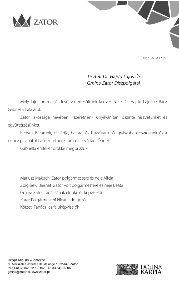 Z głębokim żalem i głęboko zasmuceni przyjęliśmy wiadomość o śmierci śp. Dr. Hajdu Lajosne Racz Gabriella 2019-11-21