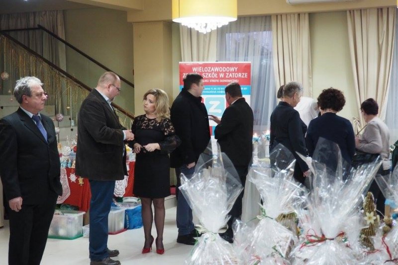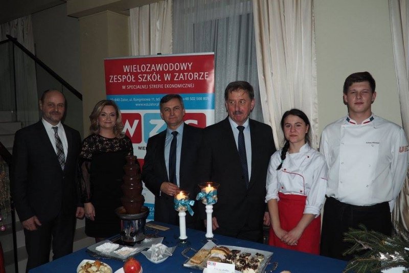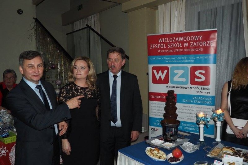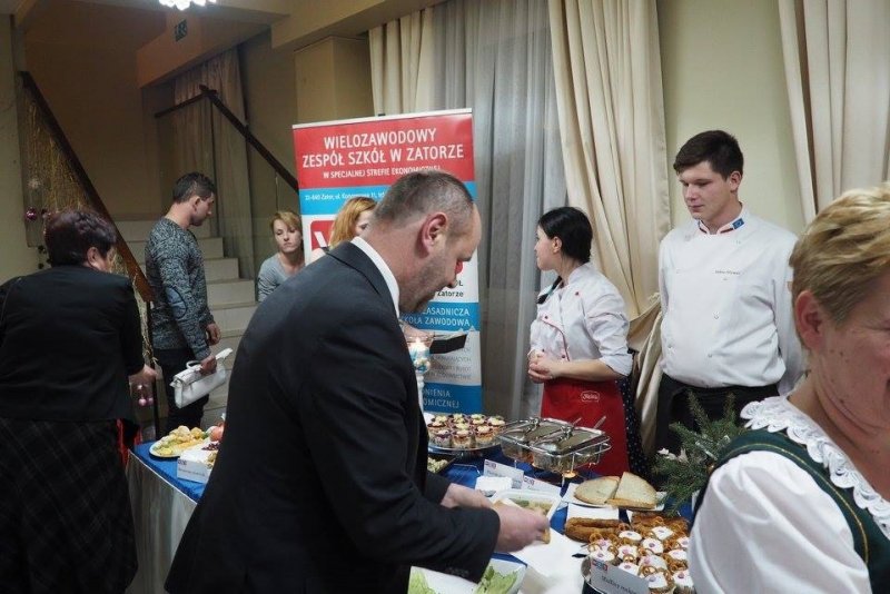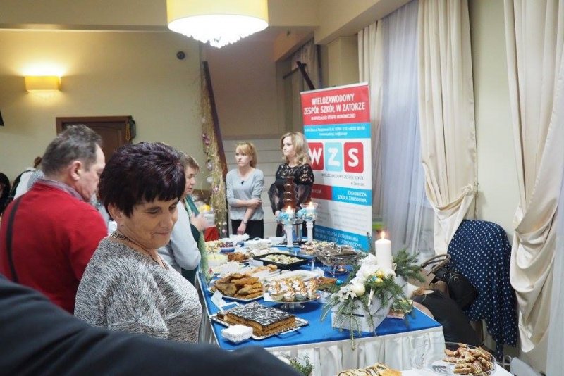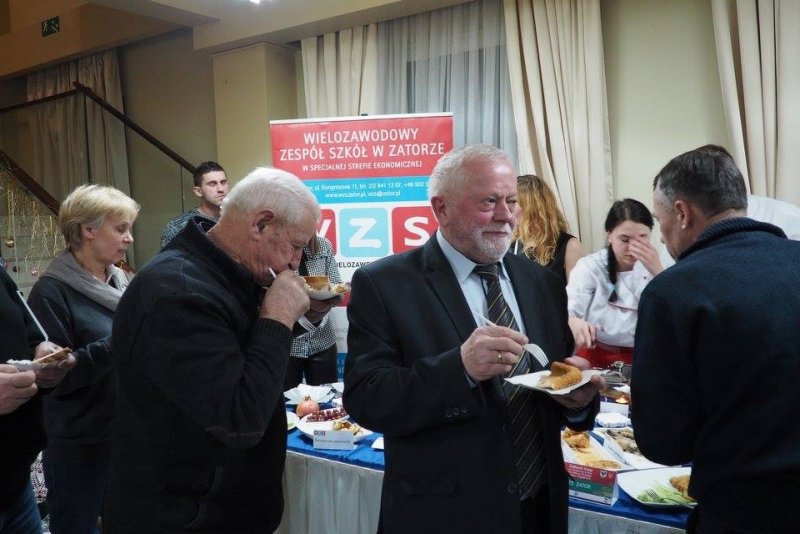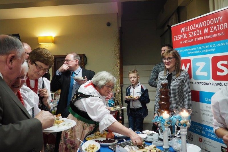 Karp: w galarecie, smażony, po żydowsku, wędzony, faszerowany, pierogi z kapustą i z grzybami, kapusta z grochem, kapusta z grzybami, łazanki, kluski, paszteciki z pieczarkami, schaby, sałatki, makowce, pierniki, strucle i dziesiątki innych wspaniale wyglądających kulinarnych dzieł sztuki kusiły swoim smakiem i zapachem. Autorkami tych dań były panie (a może i panowie) z kilkunastu kół gospodyń z powiatu oświęcimskiego. Wśród mistrzyń znalazło się także miejsce dla Wielozawodowego Zespołu Szkół w Zatorze. Wspaniale wyglądające i cudownie smakujące potrawy wykonane przez uczniów pod kierownictwem Pani Justyny Paluchowskiej zachwycały najdelikatniejsze podniebienia zaproszonych gości. Nie zapomniano także o duchowych potrzebach. W atmosferę Świąt Bożego Narodzenia wprowadziła słuchaczy anielska muzyka wypełniona brzmieniem harfy, fletu, skrzypiec, pianina i ujmującego śpiewu wspaniałych wykonawców - Anny Faber, Sylwii Kubiak i Piotra Sawickiego. Z lokalnych artystów zachwycali nas ROKband z Julką Śmiech w składzie oraz Zespół Wokalny z Graboszyc. Na wydarzeniu o zasięgu powiatowym nie mogło zabraknąć polityków z naszego regionu. Senator Andrzej Pająk, poseł Zbigniew Biernat, starosta oświęcimski Zbigniew Starzec, burmistrz Zatora Mariusz Makuch, przewodniczący Rady Miejskiej w Zatorze Stanisław Orlicki oraz sekretarz gminy Piotr Domagała znaleźli czas i odwiedzili stanowisko WZS-u. Zadowolone twarze były jednoznacznym dowodem na to, że nasi uczniowie po raz kolejny zaskoczyli wszystkich swoimi umiejętnościami. Dopełnieniem sobotniej promocji szkoły stało się stoisko z rękodziełem przygotowanym przez naszych wychowanków. Karolina Klaja zachwalała i pilnowała interesu Spółdzielni Uczniowskiej Arkadia, a Kamila Korecka oraz Łukasz Milowski z wielkim profesjonalizmem obsługiwali stanowisko WZS-u, dbając o dobrą atmosferę i przekaz rzetelnych informacji. Wszystkim za zaangażowanie w to przedsięwzięcie szczerze dziękujemy!