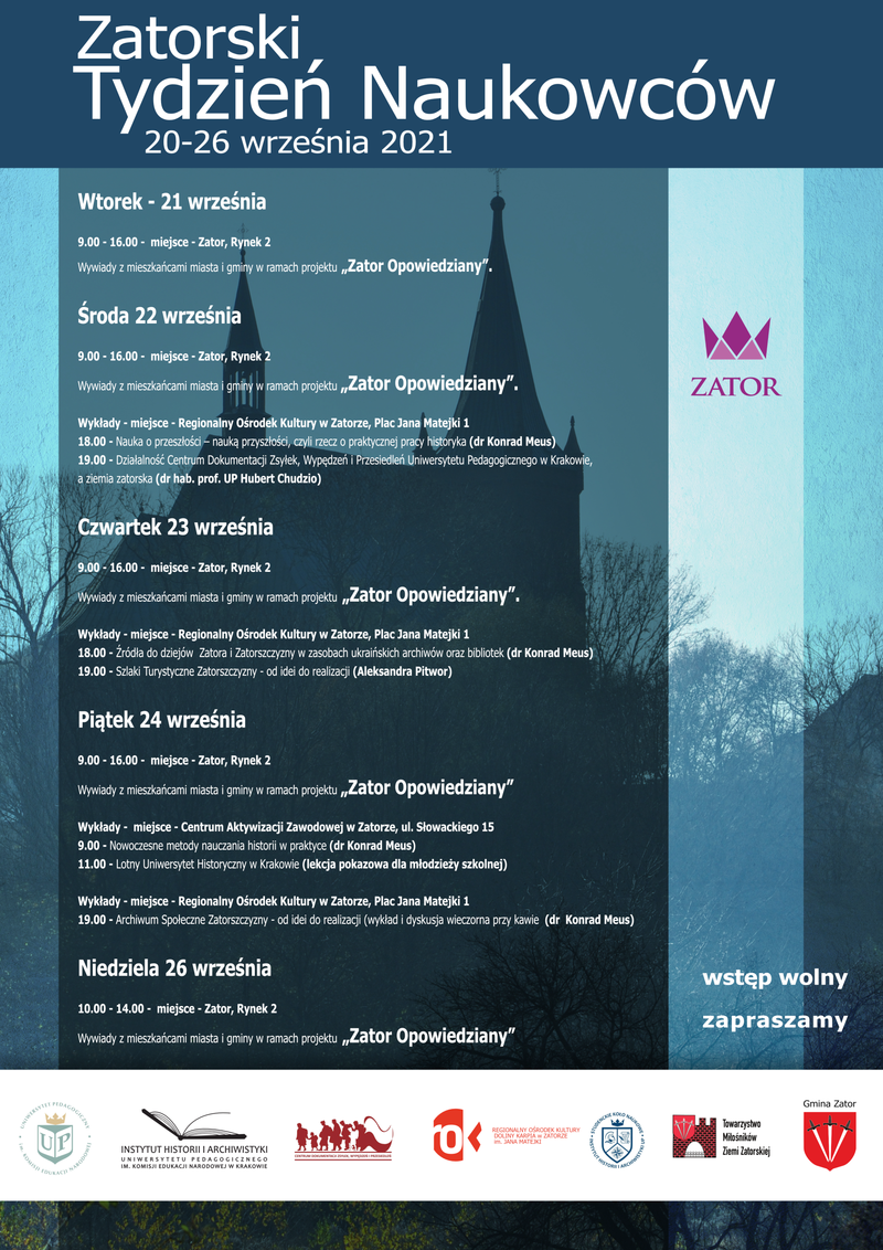 W dniach od 20 do 26 września br. Gmina Zator we współpracy z Uniwersytetem Pedagogicznym w Krakowie organizuje Zatorski Tydzień Naukowców. W ramach tego wydarzenia zaplanowaliśmy dla Państwa wykłady, konferencje, spotkania oraz wywiady z mieszkańcami. Szczegółowy program wydarzeń dostępny jest pod linkiem.