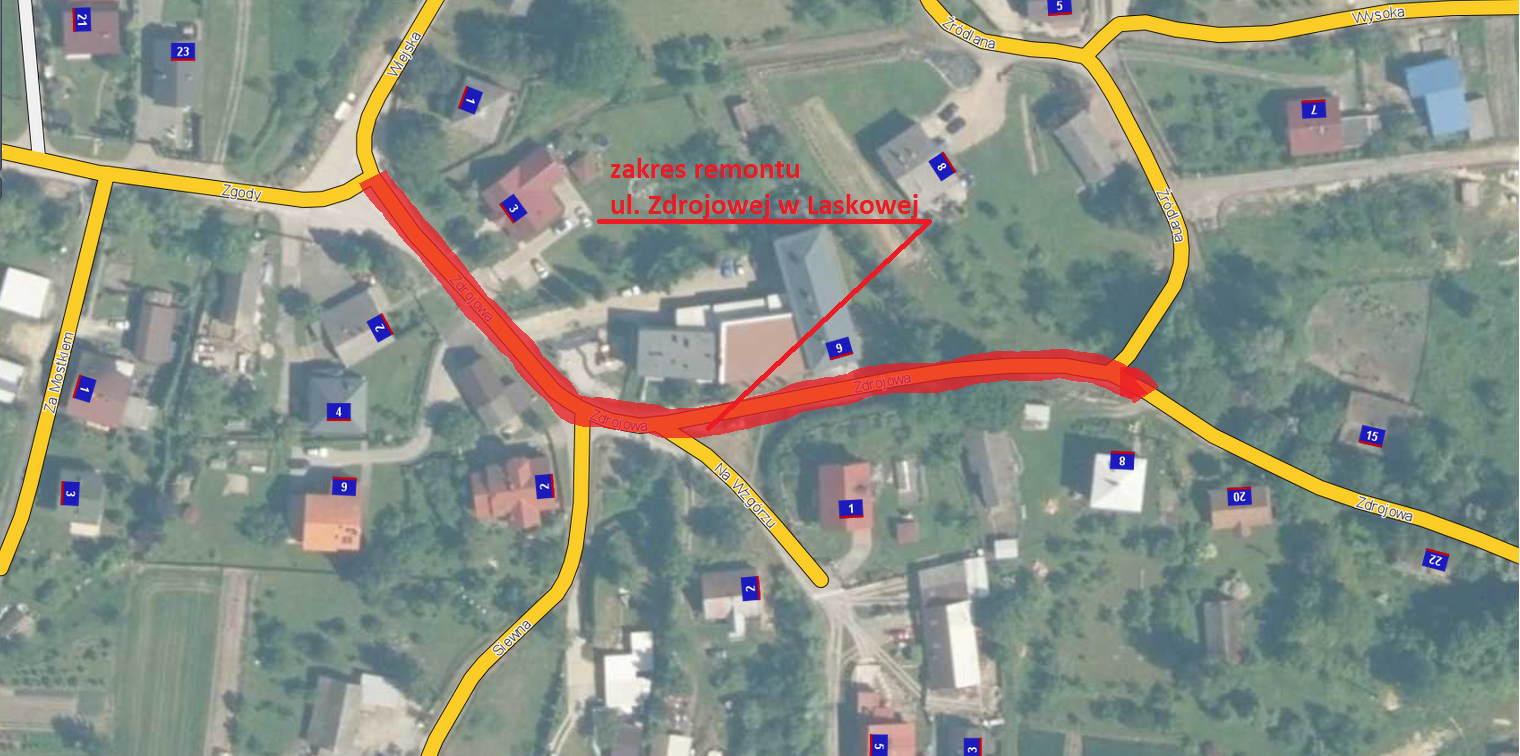 W ramach remontu ul. Zdrojowej w Laskowej (przy szkole) zostanie wykonana nowa nawierzchnia asfaltowa o długości ok 206 mb. Zostanie utwardzone i zabezpieczone pobocze drogi gminnej. Remontem objęta zostanie również kanalizacja deszczowa na przedmiotowym odcinku drogi.