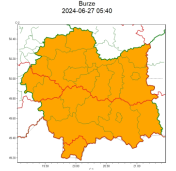 SMS IMGW-PIB OSTRZEGA: BURZE/2 małopolskie (wszystkie powiaty) od 11:00/27.06 do 23:00/27.06.2024 deszcz