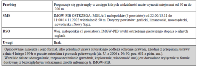 Prognozuje się gęste mgły w zasięgu których widzialność może wynosić miejscami od 50 m do 200 m
