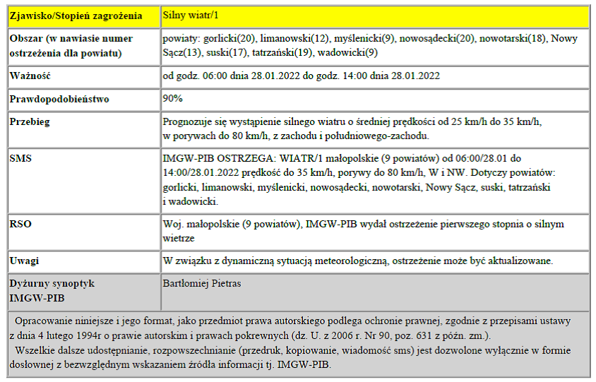 W związku z powyższym proszę podjąć stosowne działania zapobiegawcze i ostrzegawcze związane z ostrzeżeniem ludności oraz przygotować odpowiednie służby.