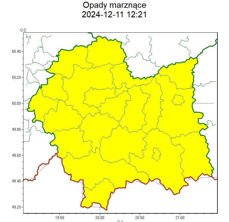 SMS IMGW-PIB OSTRZEGA: MARZNĄCE OPADY/1 małopolskie (wszystkie powiaty) od 21:00/11.12 do 10:00/12.12.2024 marznące opady, drogi śliskie. Dotyczy powiatów: wszystkie powiaty.
