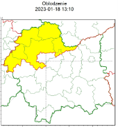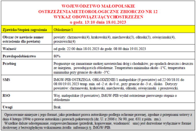 Prognozuje się zamarzanie mokrej nawierzchni dróg i chodników po opadach deszczu lub deszczu ze śniegiem powodujące ich oblodzenie.