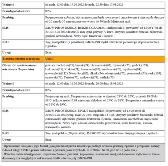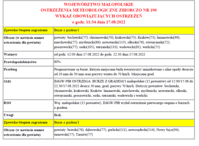 Ostrzeżenie meteorologiczne nr 190_ burze z gradem 1 stopnia Zmiana 2022-08-17