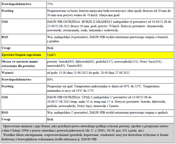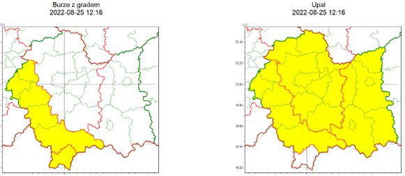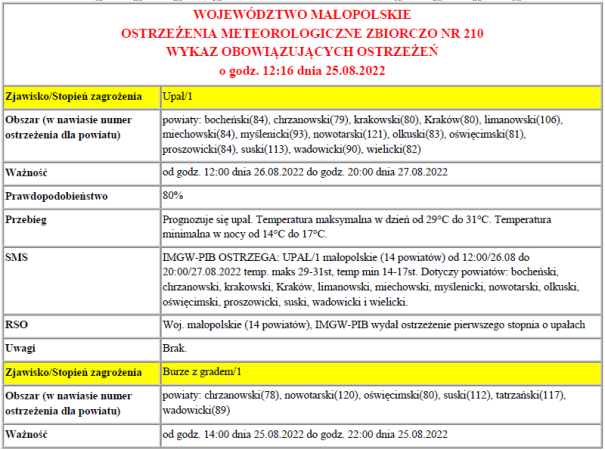 Ostrzeżenie meteorologiczne nr 210-Burze z gradem 1-upały1 2022-08-25