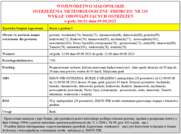 Ostrzeżenie meteorologiczne nr 220 - Burze z gradem/1 2023-08-09