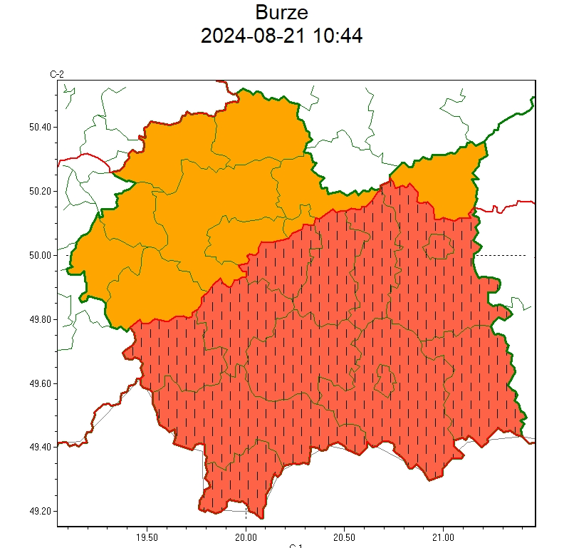 SMS IMGW-PIB OSTRZEGA: BURZE/2 małopolskie (9 powiatów) od 12:00/21.08 do