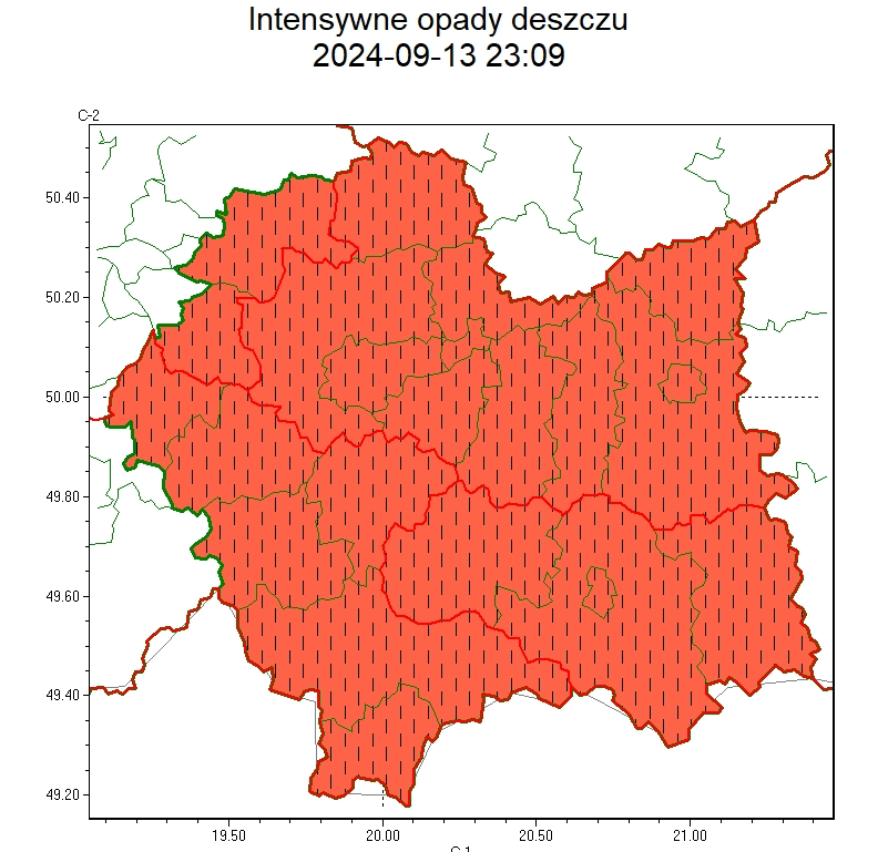 Przebieg Występują i nadal prognozowane są opady deszczu o natężeniu silnym i bardzo silnym, miejscami nawalnym. Prognozowana suma opadów dla okresu:od godz. 07.00 dnia 13.09 do godz. 07.00 dnia 14.09 wyniesie od 50 mm do 70 mm, miejscami do 90 mm, od godz. 07.00 dnia 14.09 do godz. 07.00 dnia 15.09 wyniesie od 90 mm do 120 mm, lokalnie od 150 mm do 190 mm, od godz. 07.00 dnia 15.09 do godz. 07.00 dnia 16.09 suma opadów wyniesie od 20 mm do 40 mm, miejscami do 60 mm.