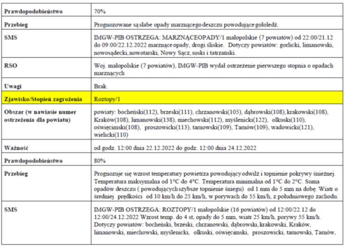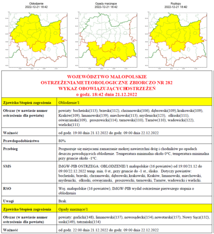 Prognozuje się miejscami zamarzanie mokrej nawierzchni dróg i chodników po opadach deszczu powodujących ich oblodzenie .......