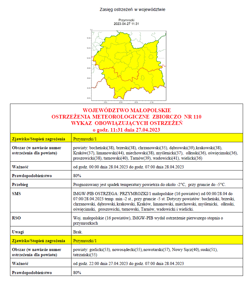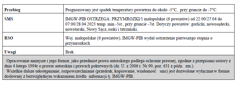 Prognozowany jest spadek temperatury powietrza do około -2°C , przy gruncie do -5°C.