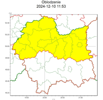 RSO Woj. małopolskie (14 powiatów), IMGW-PIB wydał ostrzeżenie pierwszego stopnia o Oblodzeniu.