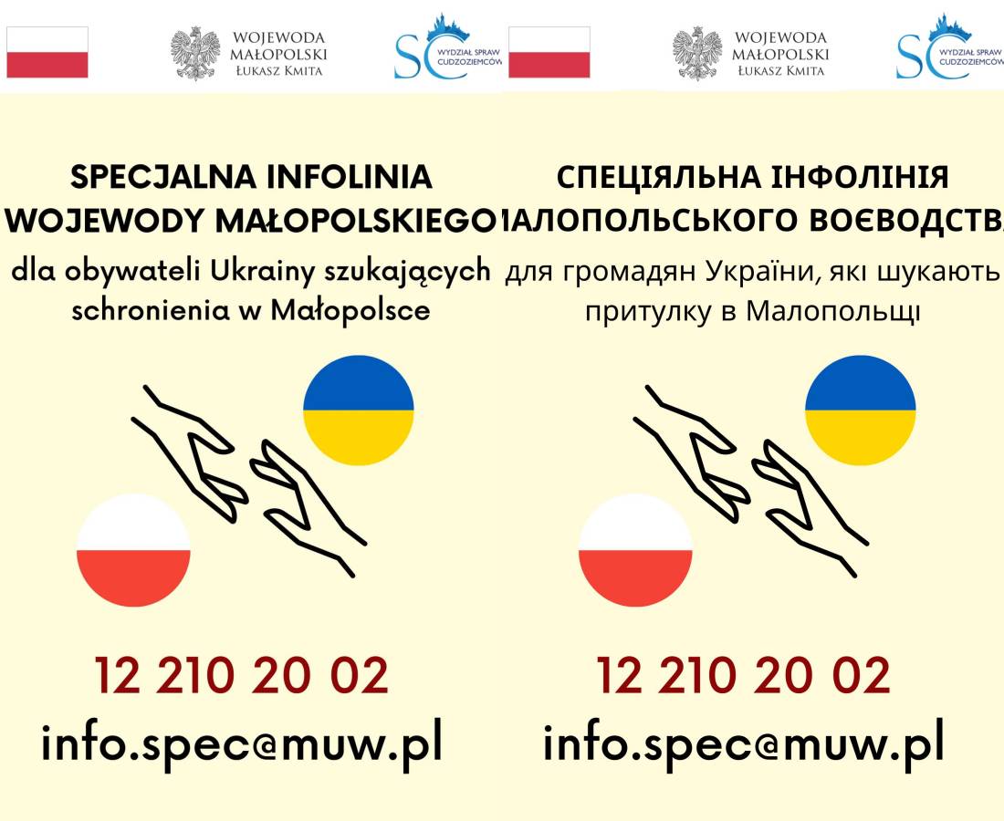 Także z tego względu dziś w południe uruchomimy infolinię w ramach Wydziału Spraw Cudzoziemców. Będzie ona działać wspierająco względem infolinii Urzędu do Spraw Cudzoziemców. Pod numerem: 12 210 20 02 nasi pracownicy będą udzielać informacji Ukraińcom szukającym schronienia w naszym województwie. Infolinia będzie czynna 24 h na dobę. Podstawowe informacje dla uchodźców z Ukrainy są opublikowane tutaj: